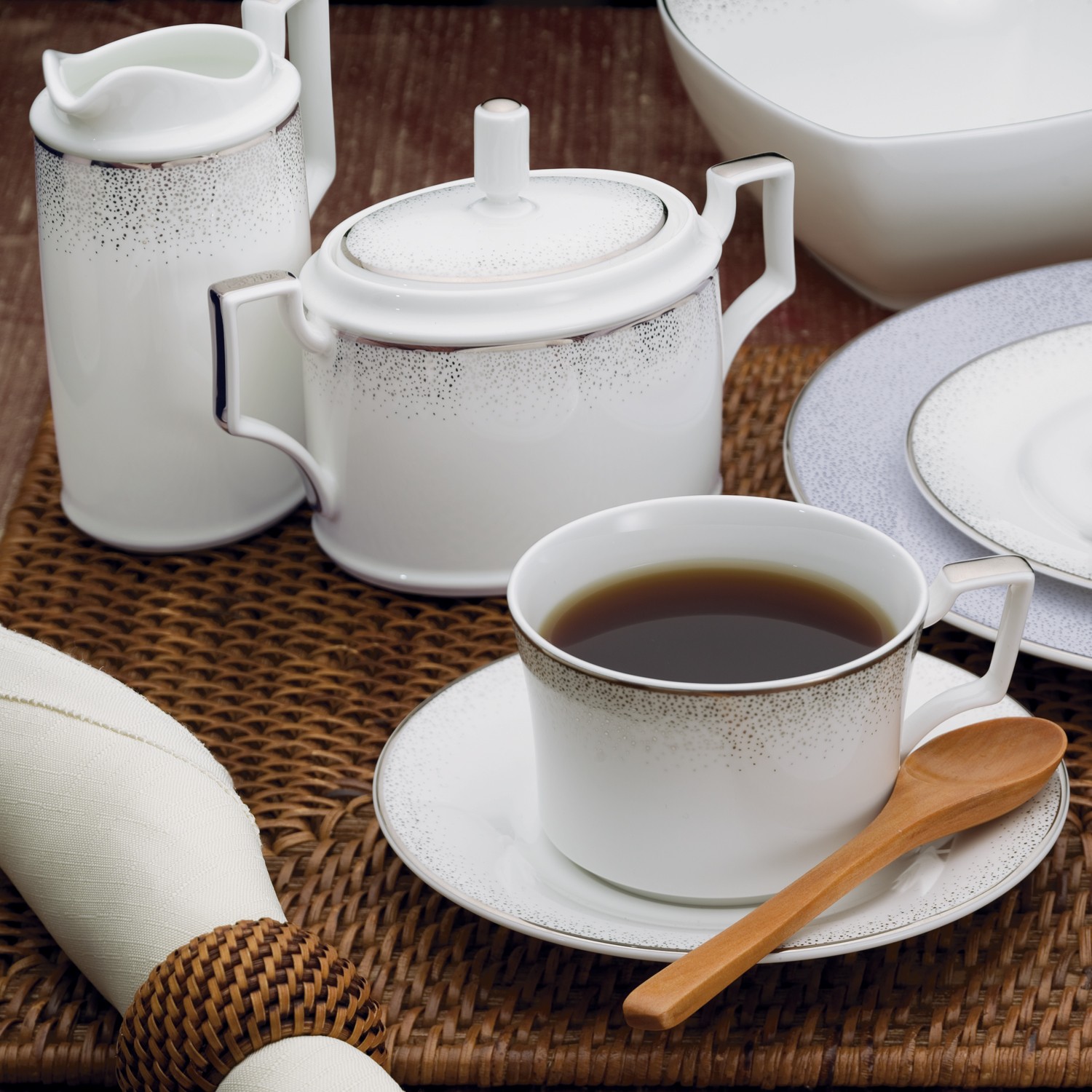This stunning pattern features finely crafted miniature platinum dots dancing along the rim of the plates in a starburst of delight.
