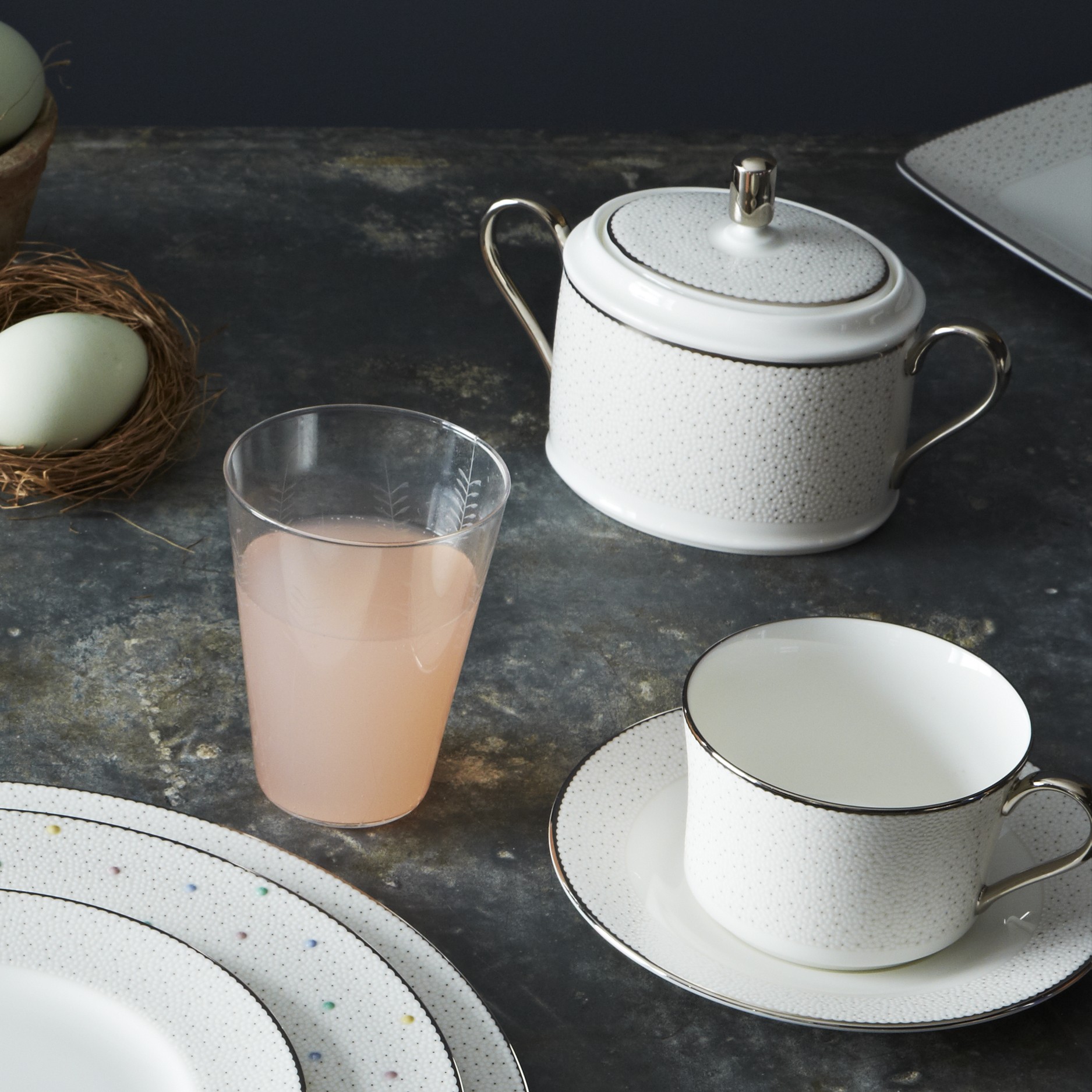Broome Street offers a three-dimensional pebbled texture on a fine bone china body. With a scalloped edge in bright platinum, the pebbled design is interspersed with complementary glistening dots of platinum.