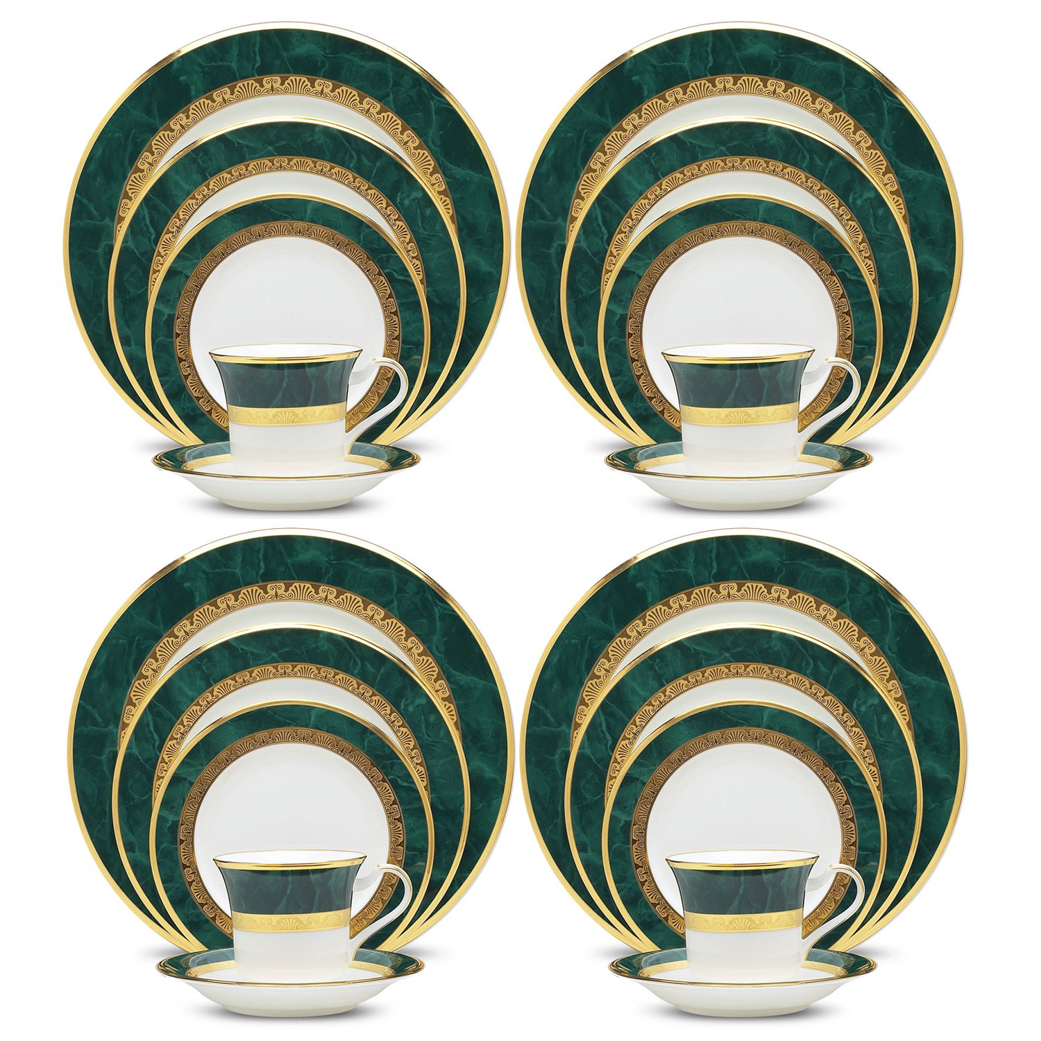 Fitzgerald features a wide rim of marbleized green with an outer band of smooth gold and an inner band of etched gold on white bone china.