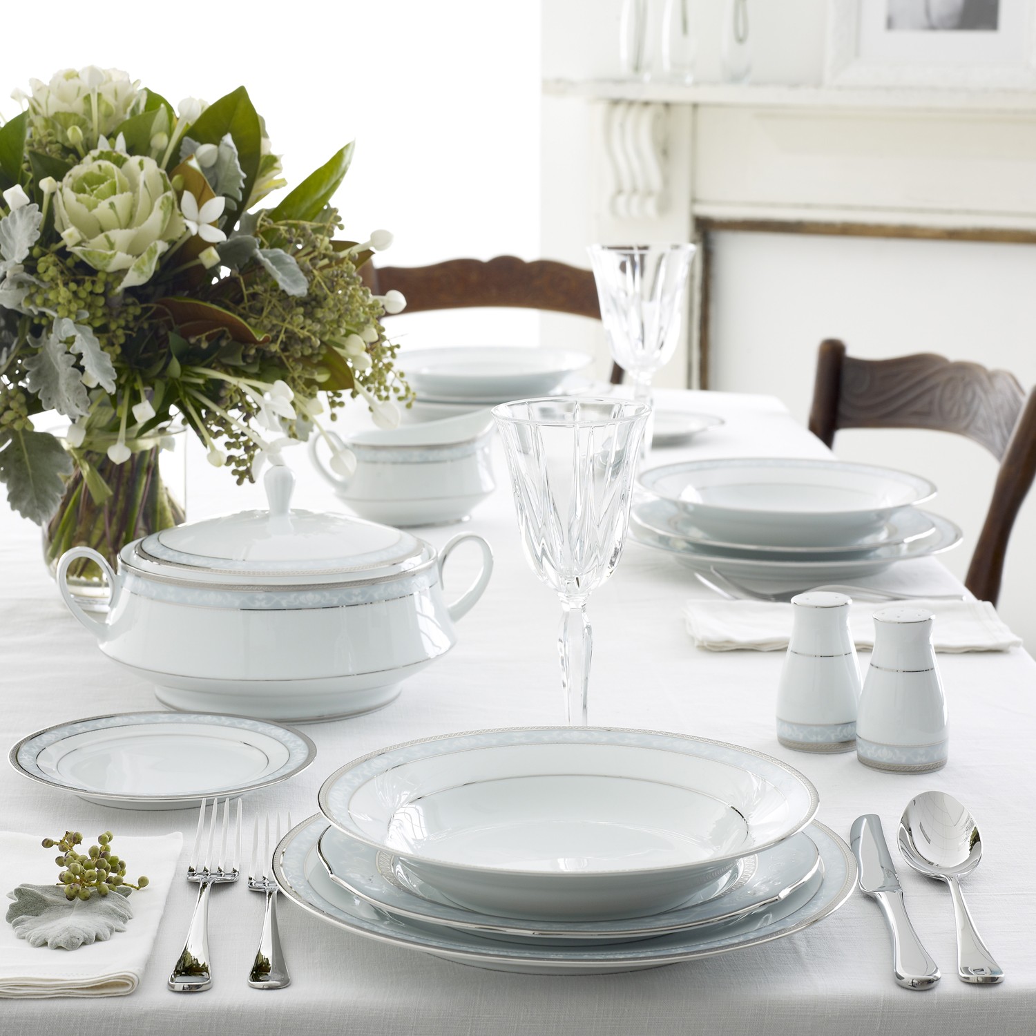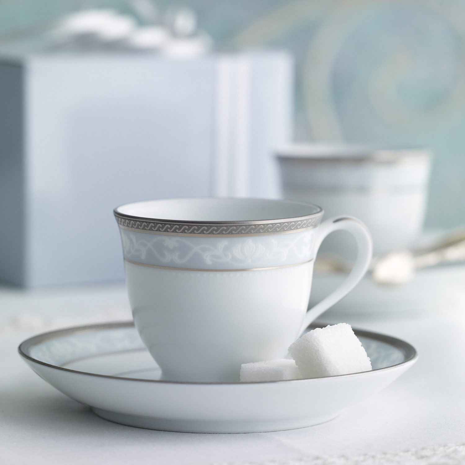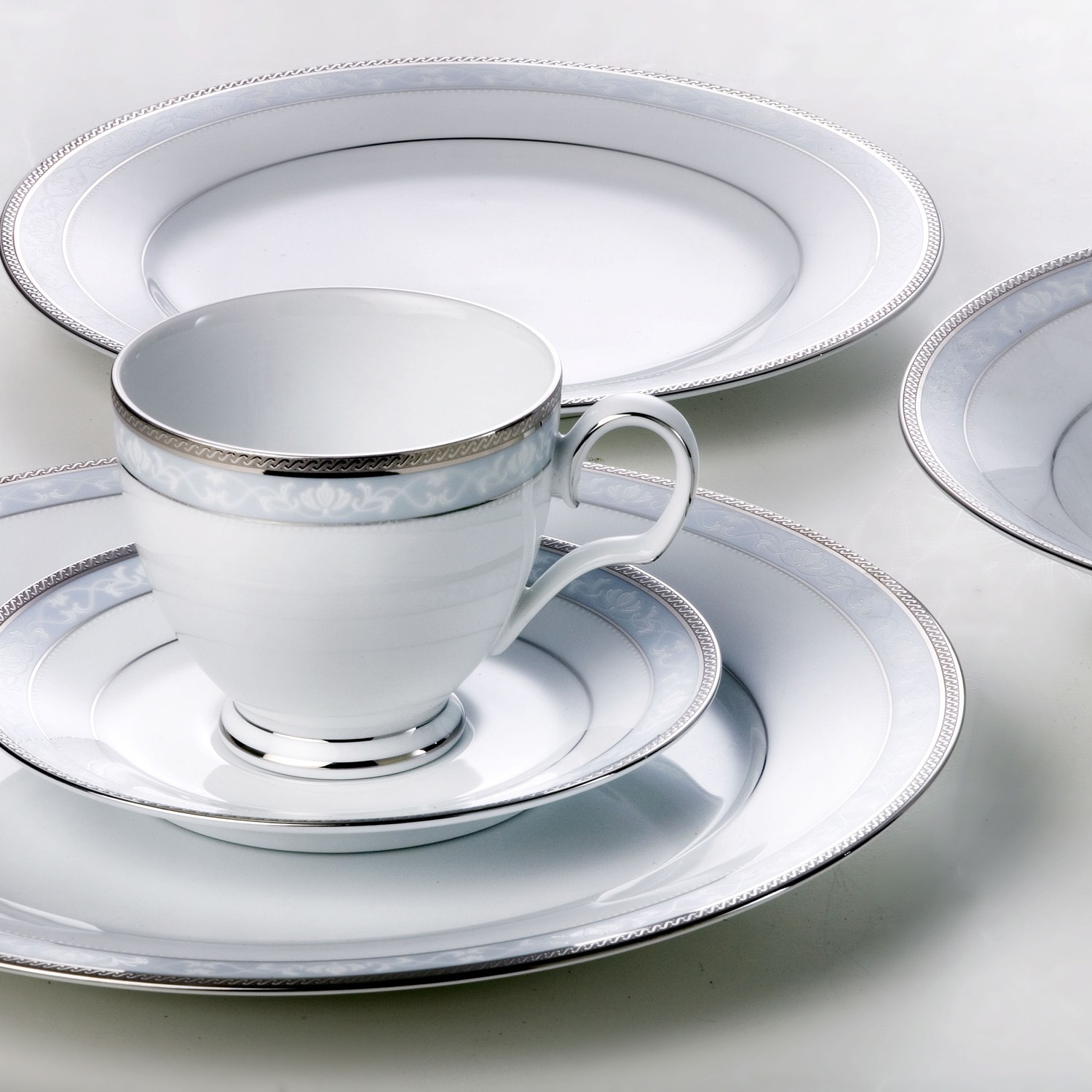 Hampshire Platinum is retired from production for the North American market. Hampshire Platinum is a formal design packed full of features. A delicate lace pattern adorns a sleek satin band of ice blue, circled by a richly embossed band of the purest platinum, all on a body of the finest white porcelain. The legendary Noritake patterns of yesteryear are the inspiration for Hampshire Platinum's classical styling and high quality finish. Although formal in style, it is also well suited for everyday use.