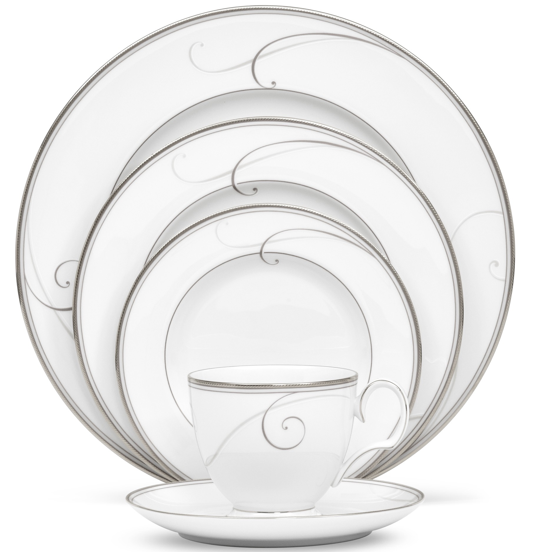 Platinum Wave is a more relaxed approach to formal dinnerware. Keeping to a simple modern feeling, this pattern interprets a classic scroll motif in an updated and playful manner. Washing against the rim of the plate, the platinum waves create a bold, yet elegant presentation. Square and round place settings, as well as a large variety of accessories, result in numerous opportunities for personalization and variety on your table. Platinum Wave coordinates with the entire Platinum and Golden Wave collection.