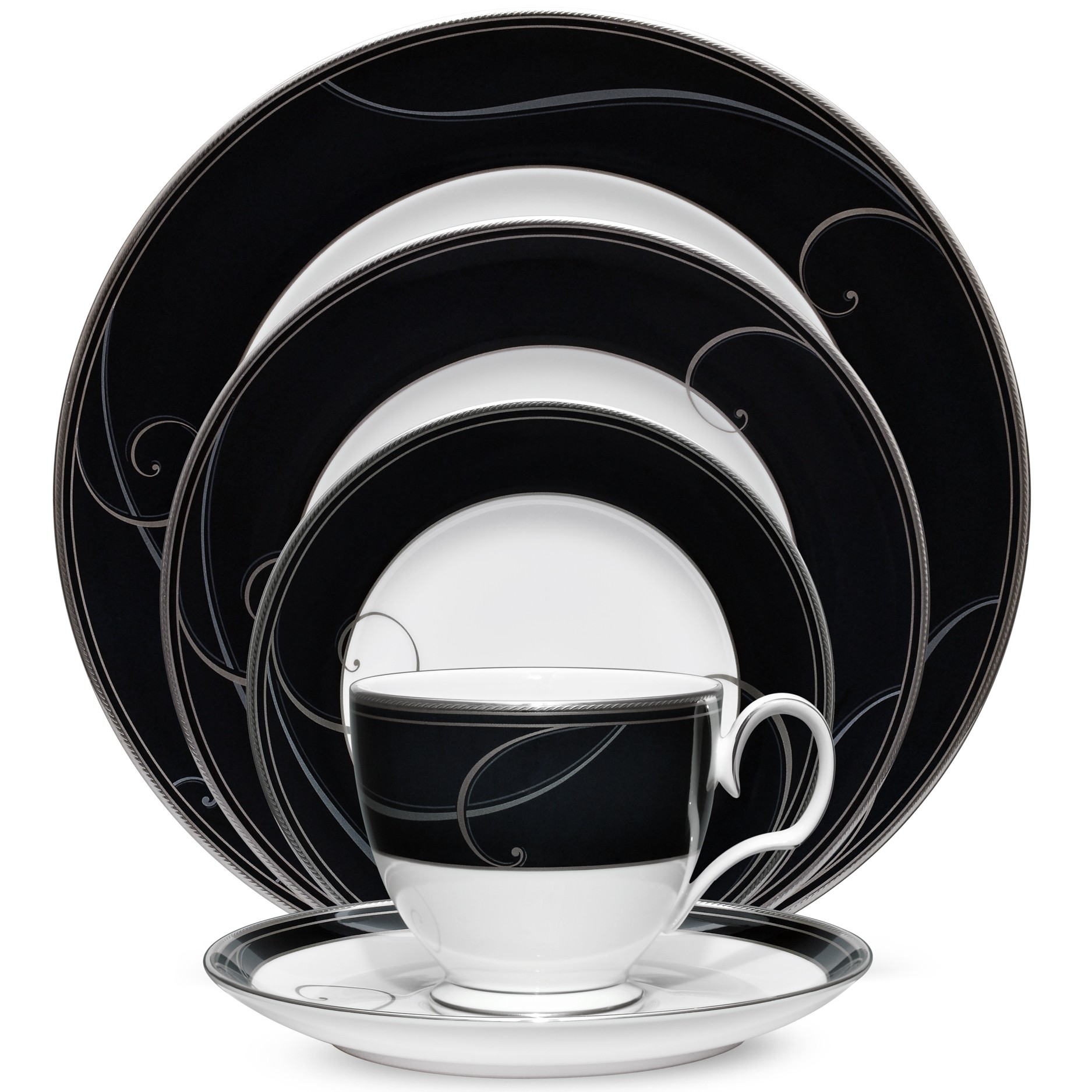 Platinum Wave Ebony is a more relaxed approach to formal dinnerware. Keeping to a simple modern feeling, this pattern interprets a classic scroll motif in an updated and playful manner. Washing against the rim of the plate, the platinum waves create a bold, yet elegant presentation. Square and round place settings, as well as a large variety of accessories, result in numerous opportunities for personalization and variety on your table.