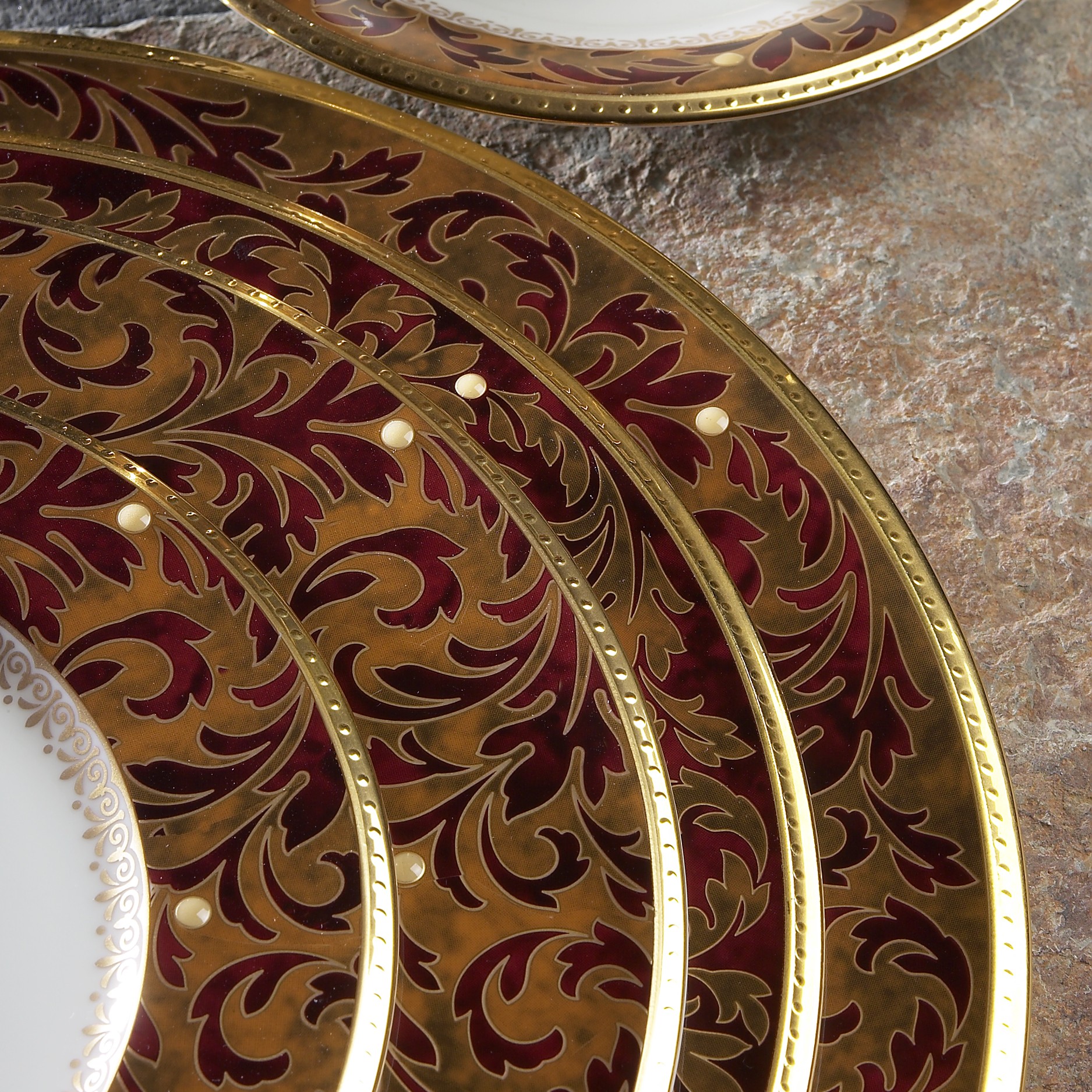 Xavier Gold features a full band of leafy swirls in rich colorations of burgundy laid over a brown background with generously applied raised enamel dots. Edged in gold, it has a look of dramatic elegance.